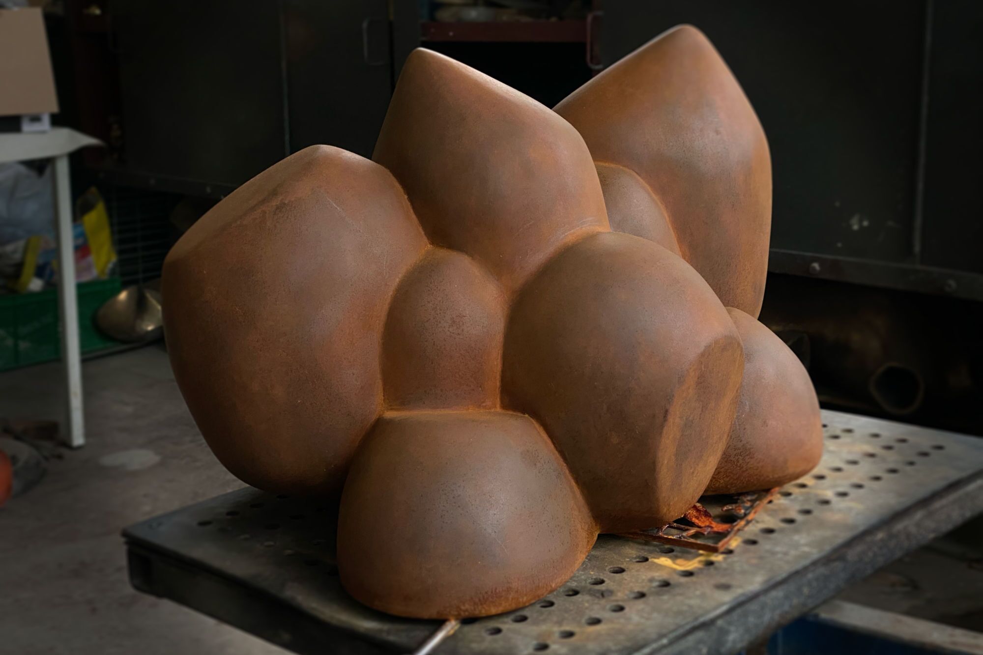 The series “Protections” centres on the idea of protection: the copper-covered wood pieces resemble shields or armour while preserving traces of growth. The series “AL,” named after the Andalusian licence code, draws on impressions from his stay in Spain and develops them into volumetric, softly rounded forms closely interlocked with one another. These organic studies also form the basis of the iron cast AL 23, realised in 2022 at the Lauchhammer Art Foundry, exemplifying the collaboration between artist and foundry.